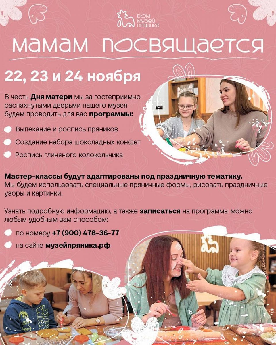 В честь прекрасного праздника, Дня Матери, для самых важных людей в нашей жизни Дом-музей Пряника подготовил различные мастер-классы, чтобы вы могли в их уютной атмосфере отпраздновать этот день в кругу своих близких и родных!
