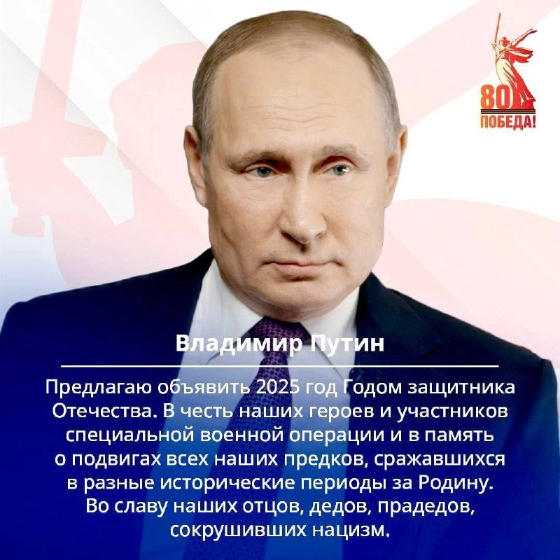 Наступивший 2025 год объявлен в России годом защитника Отечества. В 2025 мы будем отмечать 80-летие Великой Победы.